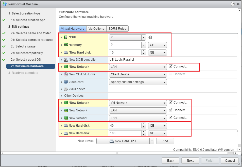8.4. Add three additional Nic’s. Set them in this order. NIC 1 and NIC2 on the VM Network, NIC 3 and NIC4 on the LAN Network. Ensure that you set you NIC type to VMXNET3.